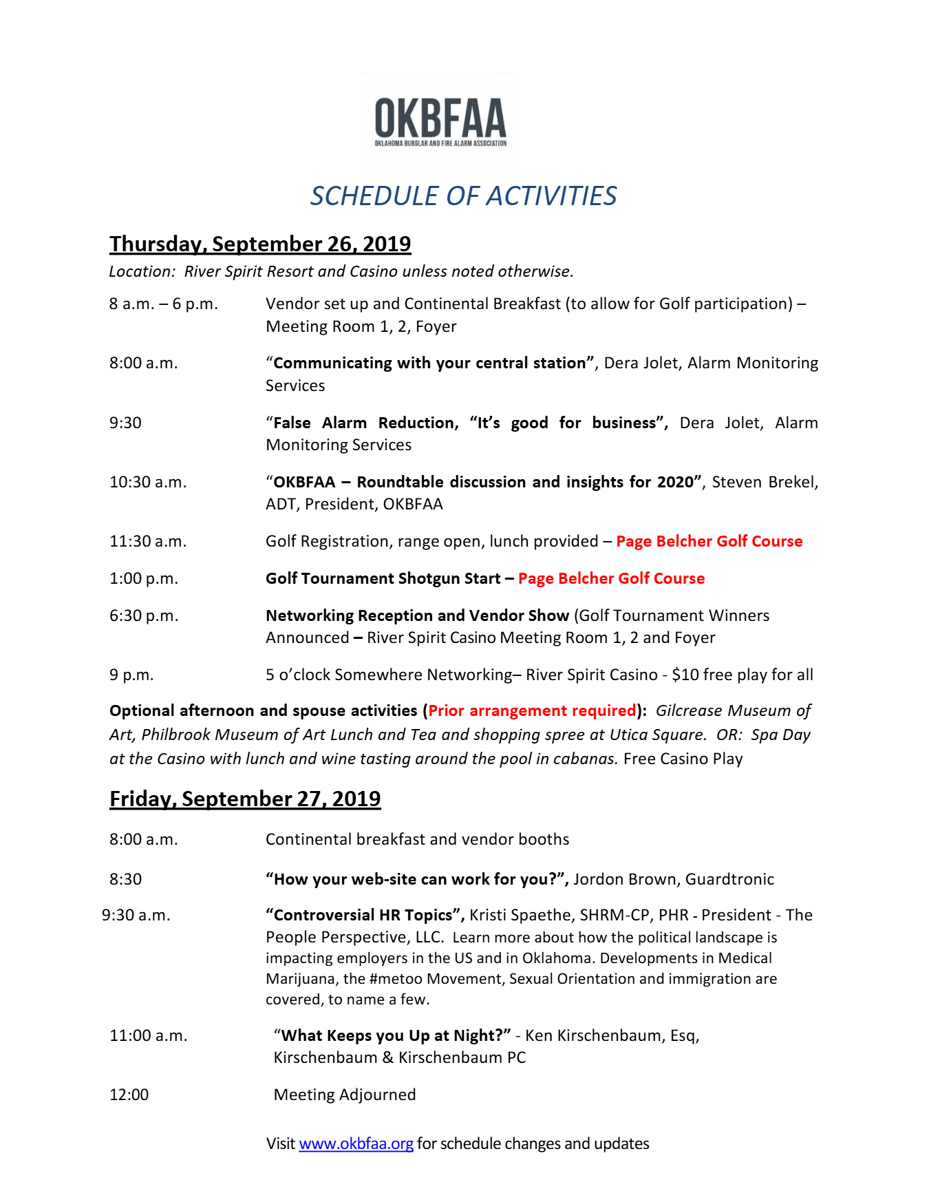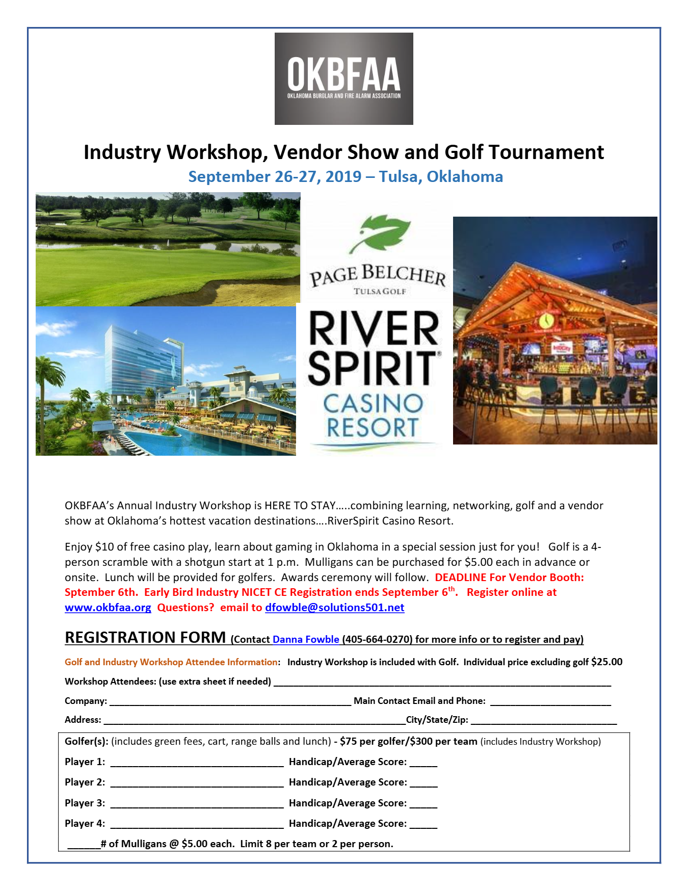 Industry Workshop, Vendor Show and Golf Tournament September 26-27, 2019 – Tulsa, Oklahoma